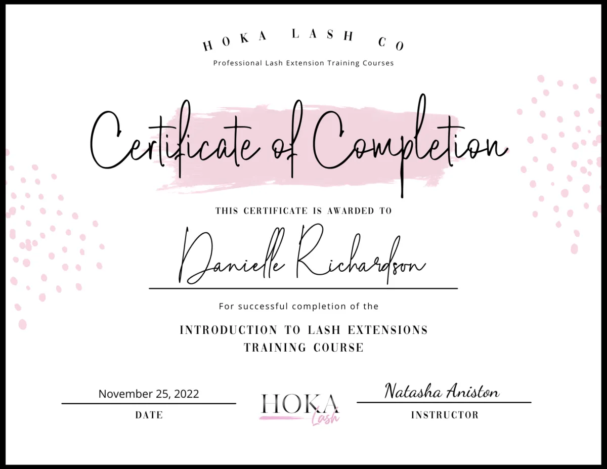 Every order comes with a link to an online exam. Once you pass the exam, you will get your official Hoka Lash Certificate of Completion! Lash Certification will be delivered digitally, with option to print and sent via first class mail.
